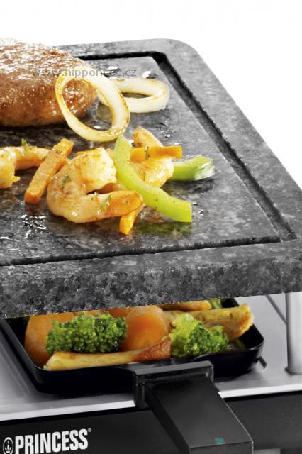Raclette gril PRINCESS 16 2720 s velkou pečicí deskou z přírodního kamene, set až pro 8 osob. Na odnímatelné kamenné desce můžete péci ryby, maso nebo zeleninu, brambory a jiné, a současně využívat raclette (pánvičky pro přípravu například sýra apod.).Vzhledem k povrchové úpravě grilovací kamenné desky je možné připravovat potraviny takřka bez tuku. Kamenná deska raclette grilu je vybavena okrajovým frézováním pro odvádění přebytečného tuku. Součástí 8 raclette pánviček a 8 dřevěných špachtliček. Příkon 1400W.