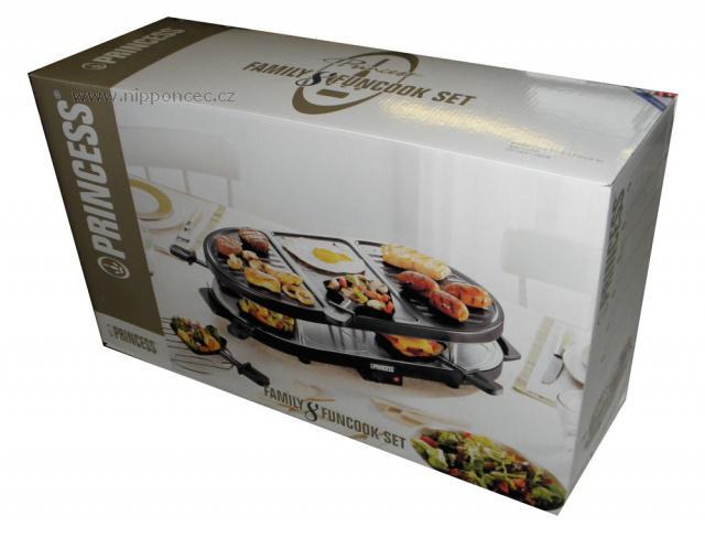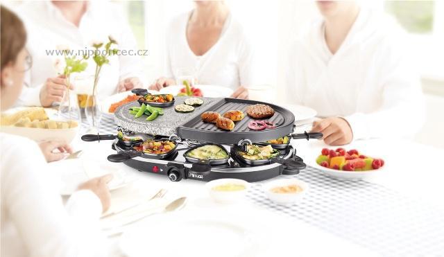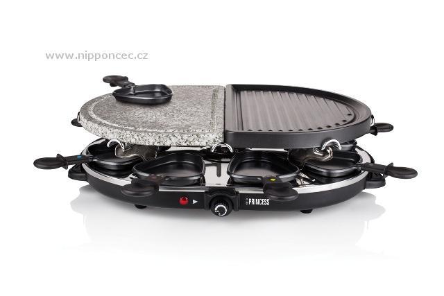Raclette gril Princess 16 2710 půl kámen, půl teflon je kombinací z poloviny klasického elektrického grilu s nepřipékavou úpravou a z poloviny grilu s pečicím kamenem, set až pro 8 osob. Na obou pečicích deskách můžete péci ryby, maso nebo zeleninu, brambory a jiné, a současně využívat raclette (pánvičky pro přípravu například sýra apod.). Vzhledem k povrchové úpravě grilovací i kamenné desky je možné připravovat potraviny takřka bez tuku, což je ideální pro zdravou přípravu téměř všech druhů potravin. Kamenná deska raclette grilu je vybavena okrajovým frézováním pro odvádění přebytečného tuku.