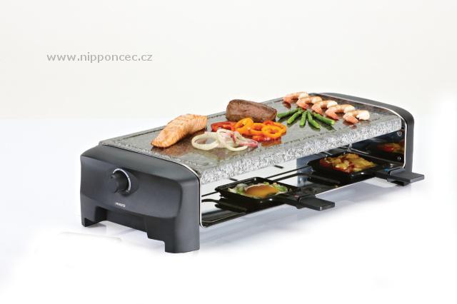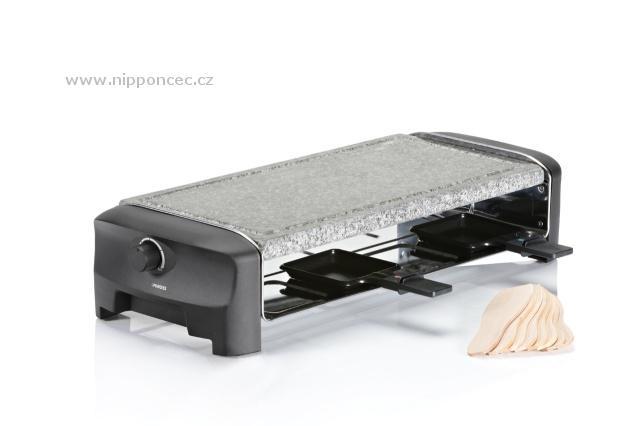 Raclette gril Princess 16 2830 8 Stone Grill Party je víceúčelový gril pro zdravé vaření bez nutnosti přidání tuku, sada až pro 8 osob. Na kvalitní nepřipékavé ploše raclette grilu Princess můžete připravit vynikající maso, zeleninu, ryby, brambory a jiné, na malém oválku pak i vejce, palačinky,bramborák. Na raclette pánvičkách lze buď péci kousky potraviny dle vaší fantazie, můžou sloužit k přípravě a ohřátí omáčky na maso nebo rozehřátí sýra. Pečicí teflonová plotna je odnímatelná, pro snadnou údržbu.