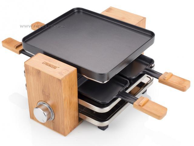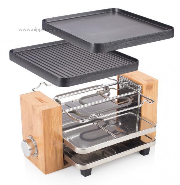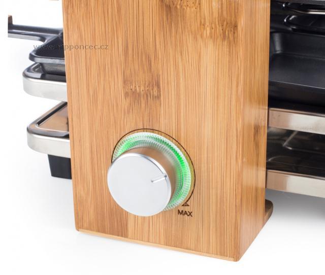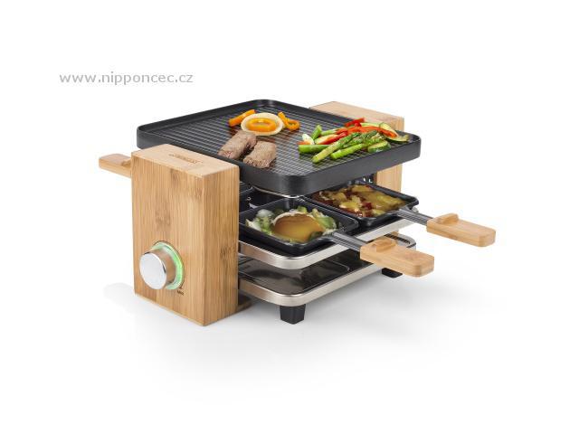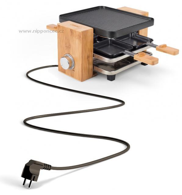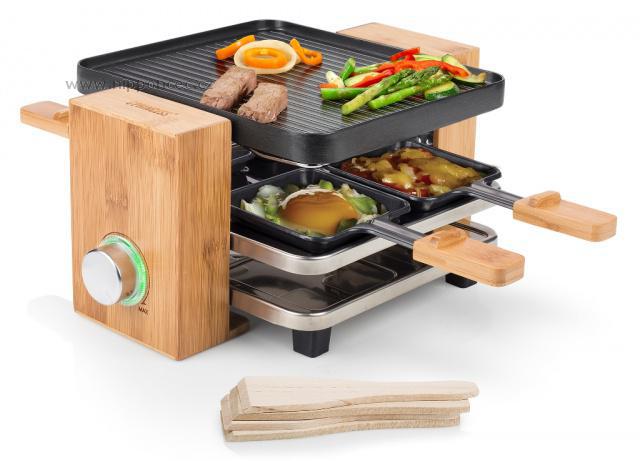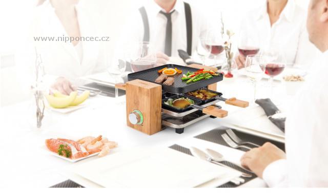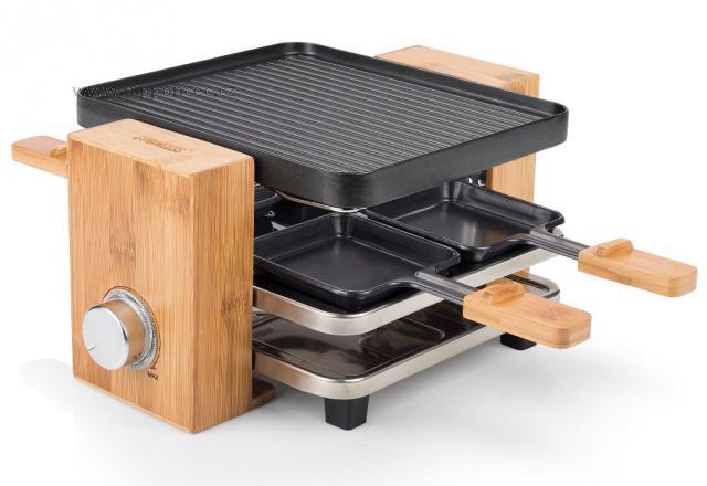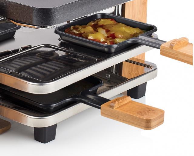 Raclette gril v luxusním provedení s pouzdrem z bambusového dřeva a otočnou plotnou z litého hliníku, která se neprohýbá. Set pro 4 osoby. Na odnímatelné pečicí desce můžete péci ryby, maso nebo zeleninu, brambory a jiné, a současně využívat raclette (pánvičky pro přípravu například sýra apod.). Vzhledem k povrchové úpravě grilovací desky je možné připravovat potraviny takřka bez tuku, což je ideální pro zdravou přípravu téměř všech druhů potravin. Zcela rozložitelný pro snadné čištění.