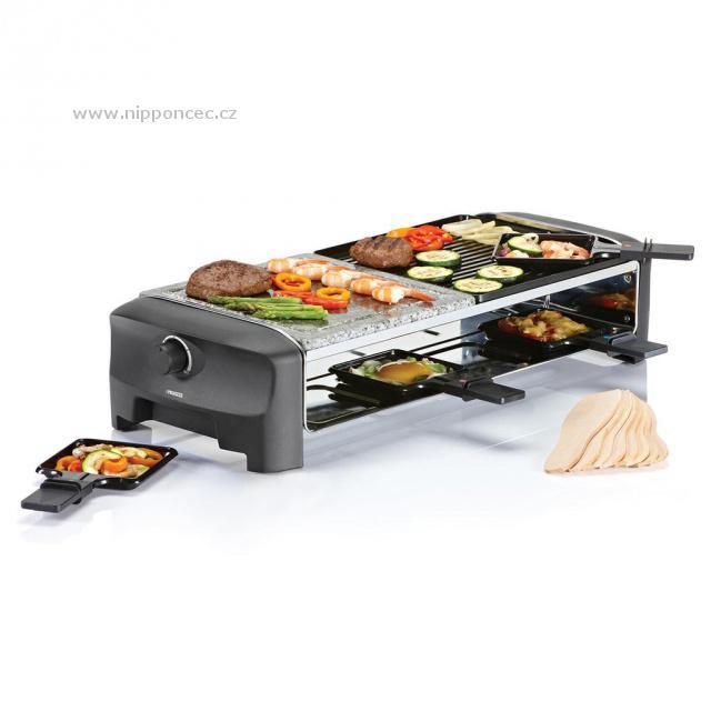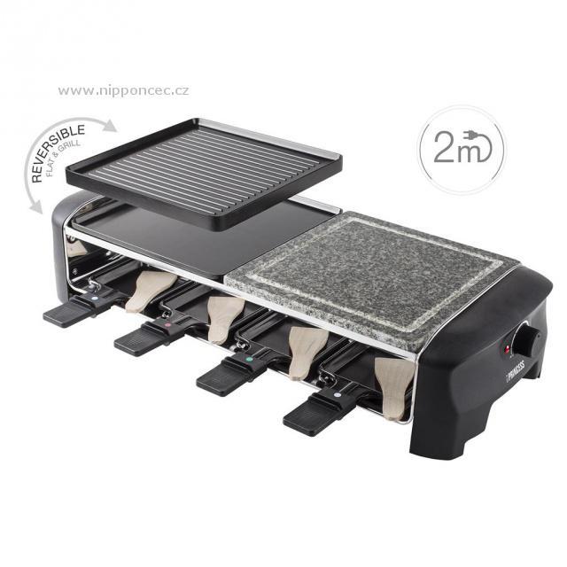 Raclette Princess 16 2820 Stone & Gril Party se skvěle hodí na posezení s přáteli nebo rodinou. Horní deska je rozdělena na dvě části - oboustrannou hliníkovou grilovací desku s nepřilnavým povrchem a pečicí desku z kamene. Vzhledem k povrchové úpravě grilovacích desek je možné připravovat potraviny takřka bez tuku, což je ideální pro zdravou přípravu téměř všech druhů potravin. Spodní patro slouží pro zapékaní sýra a dalších pochutin na raclette pánvičkách.