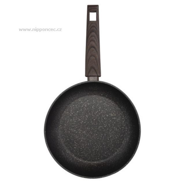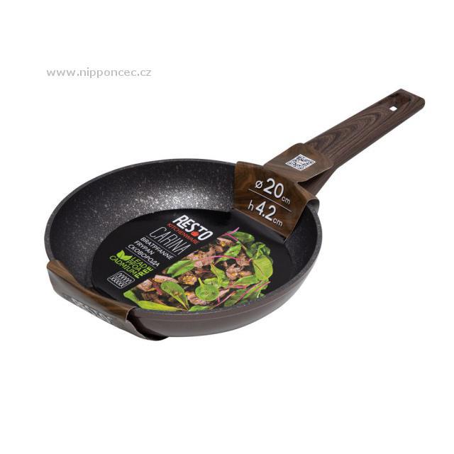 Pánev RESTO 93020 je vyrobena z kovaného hliníku, jenž zajišťuje rovnoměrné rozložení tepla a je odolný proti korozi. Uvnitř je 4vrstvý nepřilnavý mramorový povrch Pfluon se zlatým vzorem. Tento povrch neobsahuje kadmium, olovo a kyselinu perftroktanovou (PFOA). Zajímavým prvkem je ergonomická rukojeť v dezénu dřeva, která je příjemná na dotyk. Pánev je vhodná pro všechny typy sporáků, včetně indukčních. Na rozdíl od standardních pánví má spodní část vyztuženou antideformačním diskem, který prodlužuje její životnost a při zahřátí zaručuje odolnost proti deformaci.