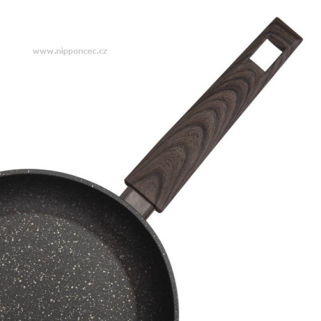 Pánev RESTO 93023 v moderním provedení je vyrobena z kovaného hliníku, jenž zajišťuje rovnoměrné rozložení tepla a je odolný proti korozi. Uvnitř je 4vrstvý nepřilnavý mramorový povrch Pfluon se zlatým vzorem. Tento povrch neobsahuje kadmium, olovo a kyselinu perftroktanovou (PFOA). Zajímavým prvkem je ergonomická rukojeť v dezénu dřeva, která je příjemná na dotyk. Pánev je vhodná pro všechny typy sporáků, včetně indukčních. Na rozdíl od standardních pánví má spodní část vyztuženou antideformačním diskem, který prodlužuje její životnost a při zahřátí zaručuje odolnost proti deformaci.