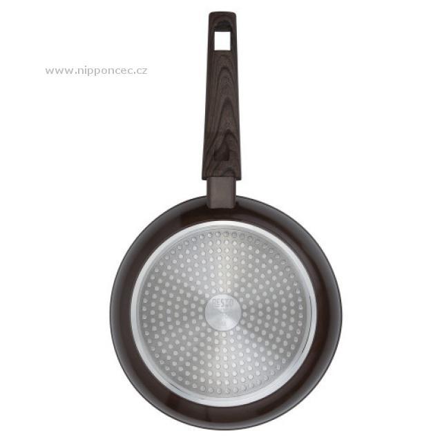 Pánev RESTO 93024 v moderním provedení je vyrobena z kovaného hliníku, jenž zajišťuje rovnoměrné rozložení tepla a je odolný proti korozi. Uvnitř je 4vrstvý nepřilnavý mramorový povrch Pfluon se zlatým vzorem. Tento povrch neobsahuje kadmium, olovo a kyselinu perftroktanovou (PFOA). Zajímavým prvkem je ergonomická rukojeť v dezénu dřeva, která je příjemná na dotyk. Pánev je vhodná pro všechny typy sporáků, včetně indukčních. Na rozdíl od standardních pánví má spodní část vyztuženou antideformačním diskem, který prodlužuje její životnost a při zahřátí zaručuje odolnost proti deformaci.