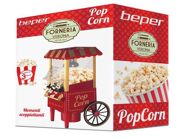 Fandíte klasice - film a čerstvý popkorn? Výrobník popcornu Beper je designovaný podle typického cinema popkornovače z 50. let. Připravte si vynikající popkorn bez oleje - slaný nebo sladký dle vašich preferencí, za malou chvíli. Díky pokročilému systému cirkulace horkého vzduchu připravíte popcorn za méně než tři minuty bez přidání tuku a získáte lahodné a lehce stravitelné občerstvení.