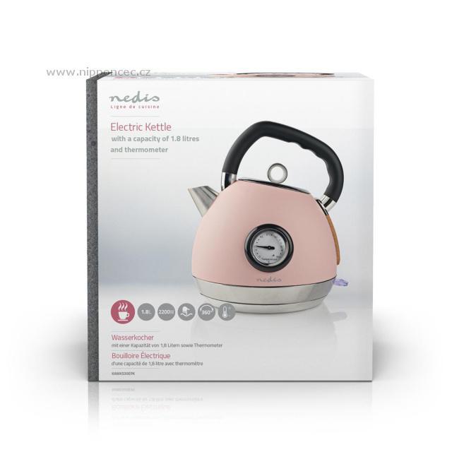 Rychlovarná konvice Nedis KAWK530EPK 1,8L je v růžovém provedení. Díky otočné základně se s konvicí skvěle manipuluje. Obsahuje teploměr, díky kterému budete hned vědět jakou máte teplotu vody. S extra velkým objemem 1,8 litru připravíte veškerou vodu, kterou potřebujete na zalití kávy, čaje, těstovin nebo instantních nudlí. Konvice je navíc vybavena základnou o 360º. Obsahuje skryté topné těleso, díky kterému voda rychle dosahuje varu a také vyjímatelný filtr proti vodnímu kameni.