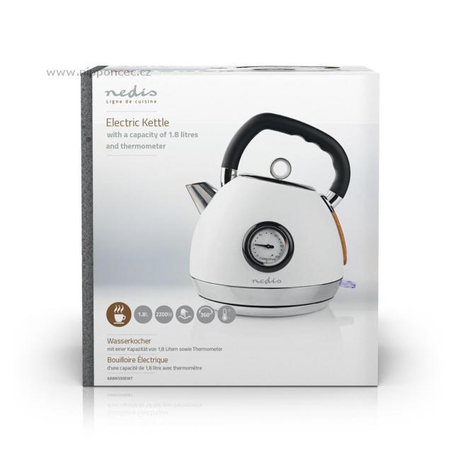 Rychlovarná konvice Nedis KAWK530EWT 1,8L je v bílém provedení. Díky otočné základně se s konvicí skvěle manipuluje. Obsahuje teploměr, díky kterému budete hned vědět jakou máte teplotu vody. S extra velkým objemem 1,8 litru připravíte veškerou vodu, kterou potřebujete na zalití kávy, čaje, těstovin nebo instantních nudlí. Konvice je navíc vybavena základnou o 360º. Obsahuje skryté topné těleso, díky kterému voda rychle dosahuje varu a také vyjímatelný filtr proti vodnímu kameni.