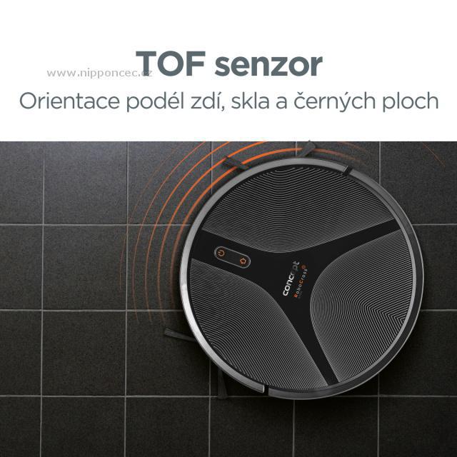 • TOF senzor - dokonalá orientace: Robot je vybaven speciálním čidlem, které zajišťuje perfektní orientaci podél zdí. Současně chrání vysavač i nábytek před poškozením, protože během práce si robot udržuje mírný odstup od veškerých překážek, takže nedochází k nárazům. Tento senzor zároveň slouží k detekci skla a černých stěn, takže si robot poradí s úklidem i podél těchto ploch.