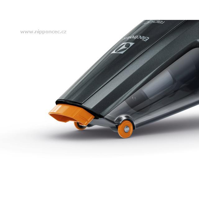 Ruční aku vysavač Electrolux Rapido ZB6114IGM je vždy po ruce připraven na rychlý úklid. Díky nové lithiové baterii TurboPower, která zajišťuje konstantně vysoké sání, je nyní výkonnější než kdy dříve. Výdrž vysavače je 12 až 24 minut dle zvoleného režimu vysávání. Kapacita baterie časem nedegraduje a nabije se za pouhé čtyři hodiny. Integrovanou štěrbinovou hubici Easy ReachTM lze vytáhnout během vysávání a tak ji máte vždy po ruce pro vysávání prachu i z těžko dostupných míst. Nádobu na prach o objemu 0,5 l lze vyprázdnit manuálně nebo hygienicky za použití hadice vašeho hlavního vysavače. Kolečka Soft SteerTM usnadňují vysávání a chrání choulostivé povrchy.