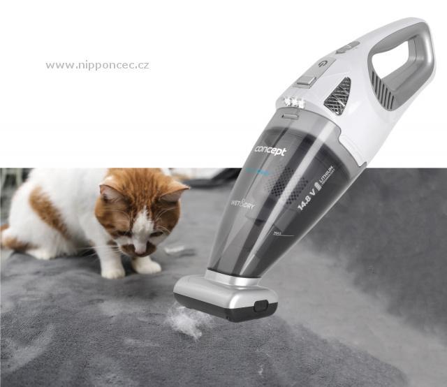 ruční aku vysavač Concept VP4370 na suché i mokré vysávání nabízí vysoký sací výkon až 5,5 kPa. Ruční vysavač je ideální pro majitele domácích mazlíčků, jelikož je vybavený výkonným motorizovaným PET turbokartáčem, který si poradí se zvířecími chlupy, jak na koberci, pohovce nebo ve vašem automobilu. Vysavač nabízí až 40 minut provozu na jedno nabití.                                            Kompaktní Aku ruční vysavač Concept VP4370 na suché i mokré vysávání
