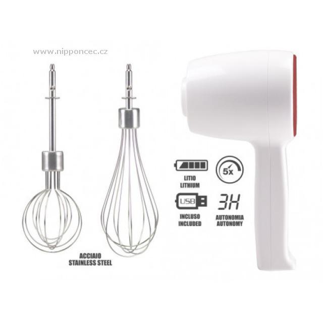 Praktický akumulátorový šlehač Beper P102SBA007 k rychlému mixování a šlehání různých potravin. Tento ruční mixér disponuje malými rozměry a nízkou hmotností. Je příjemný do ruky, lehký, přenosný, snadno se s ním při vaření manipuluje. Dva nerezové šlehače pro pohodlné šlehání a míchání. Tradiční šlehač vhodný pro přípravu majonézy, míchání krémů a omáček. Balónová šlehací metla k zapracování velkého množství vzduchu a k promíchání šlehaných ingrediencí, vhodná ke šlehání smetany a bílků, k emulgaci a k míchání konzistentnějších přípravků, jako jsou máslové krémy. Šlehač se dobíjí přibližně 4 hodiny a nabízí autonomní provoz přibližně 3 hodiny. USB nabíjecí kabel je součástí balení.