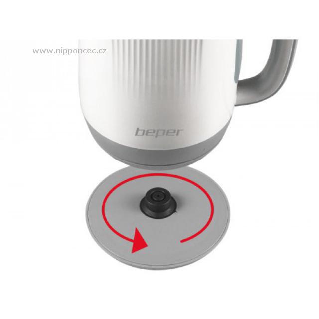 Rychlovarná konvice BEPER BB100 má objem 1,7 l a příkon 2200 W. Disponuje odnímatelným a omyvatelným filtrem, tudíž není problém filtr jednoduše vyjmout a vyčistit. Konvice má krytou topnou spirálu. Samozřejmostí je ukazatel úrovně vody. Disponuje 360° otočnou základnou.