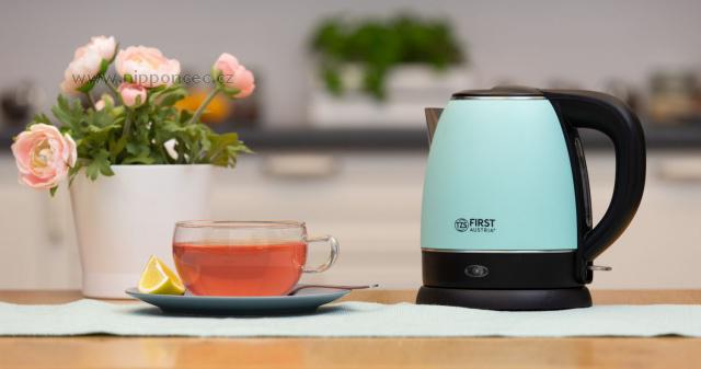 Rychlovarná konvice First Austria FA-5409-6 s extra velkým objemem 1,7 l a povrchovou úpravou z nerezové oceli. Odnímatelný filtr v hubici, otočná základna 360 st. - pro leváky, i praváky, příkon 1850-2200 W, ochrana proti převaření, automatické vypnutí.