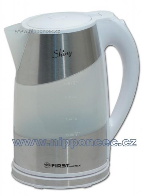 Rychlovarná konvice Shiny od společnosti First Austria. Prostřední část mění barvu dle teploty vody - modrá, bílá, červená. Konvice je v bílé barvě, s nerezovými akcenty. Obsah 1,7 litru, skrytá spirála, 360 st. otočná, 2200W, třístupňové jištění.