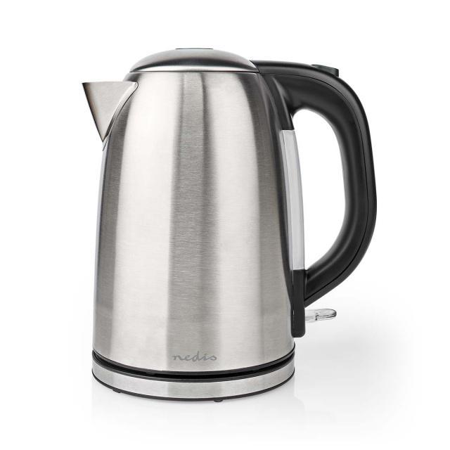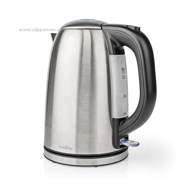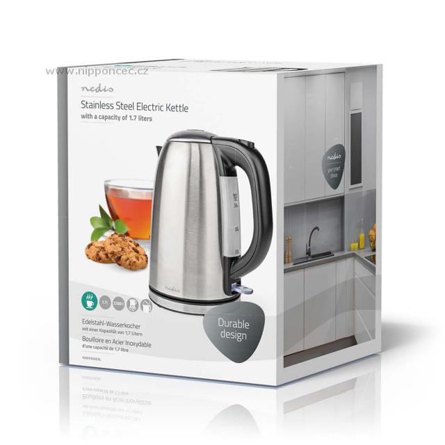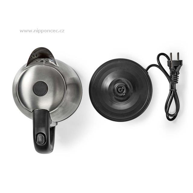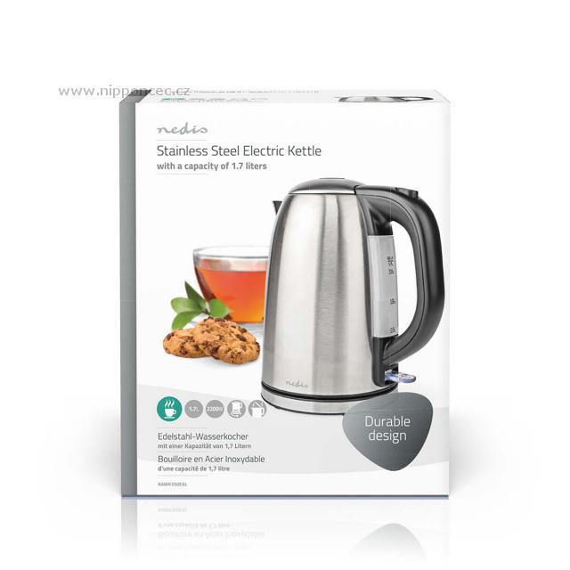 Rychlovarná konvice Nedis KAWK350EAL v nerezovém provedení rychle dosáhne varu díky topnému tělesu s příkonem 2200 W. S objemem 1,7 litru lze připravit dostatek vroucí vody na zalití plné konvice čaje nebo až 8 šálků. Víko se hladce otevírá stisknutím tlačítka, nepřijdete tak do kontaktu s párou. Konvice je navíc vybavena základnou o 360º, takže umístění konvice je snadné, ať jste levák nebo pravák. Po dosažení varu se konvice automaticky vypne.