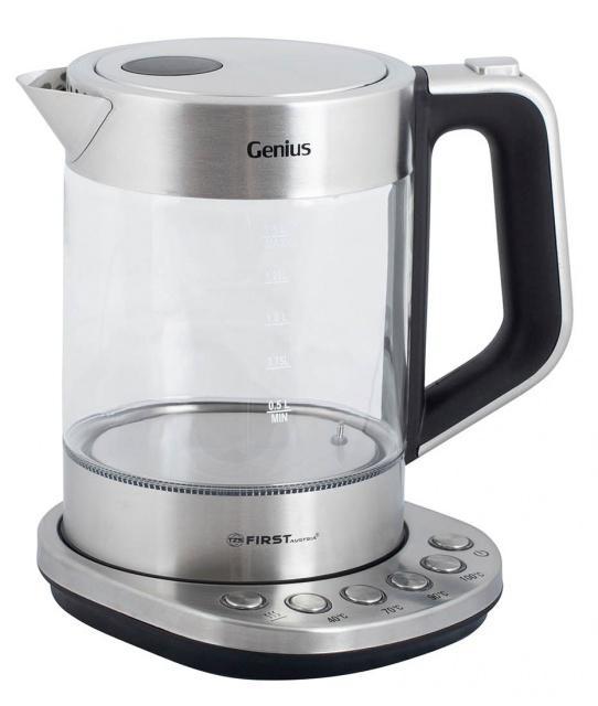 Rychlovarná konvice First Austria, s nastavitelnou teplotou. Teplotu je možno nastavit v na 40/70/90/100 °C, tudíž je vhodná pro milovníky čaje. Konvice je skleněná, s odměrkou, perfektního designu s černými doplňky a nerezovými akcenty. Konvička je vhodná pro leváky i praváky, 360° otočná. Je vybavena vnitřním osvětlením, skrytou topnou spirálou, filtrem v hubici a pojistkou proti přehřátí. Disponuje příkonem 1850 - 2200W.