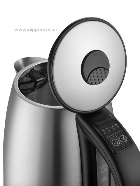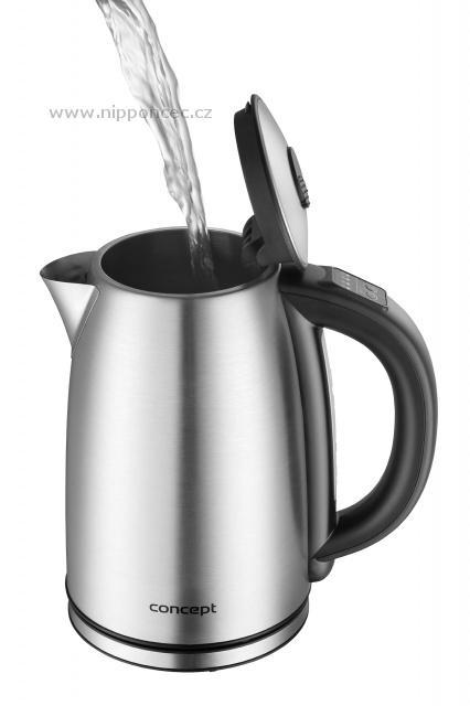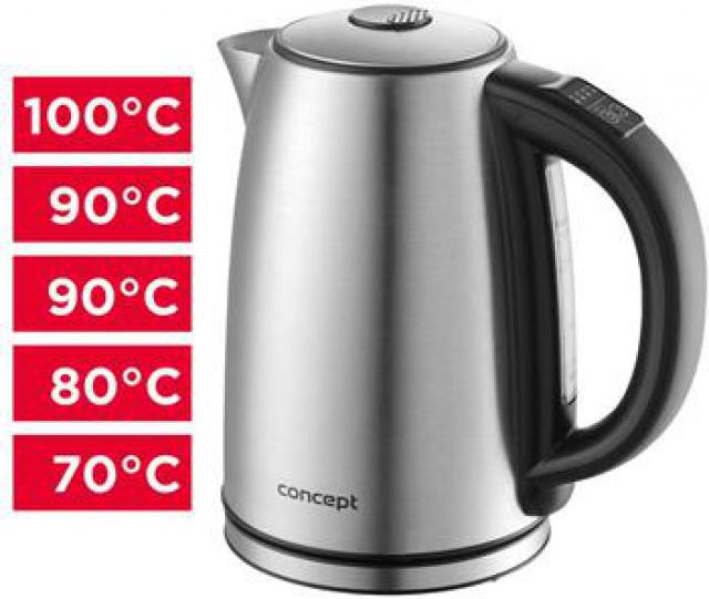 Rychlovarná konvice s objemem 1,7 l Concept RK3350 ohřeje a udrží vodu na požadované teplotě. Umožňuje regulaci teploty ve čtyřech stupních od 70 °C do bodu varu. Pomocí digitálního ovládání jednoduše zvolíte přesně takovou hodnotu, jakou potřebujete. Pokud si svůj nápoj nestihnete včas zalít, funkce KEEP WARM vám vodu udrží na požadované teplotě. Trojnásobný bezpečnostní systém zaručí, že se konvice automaticky vypne po dosažení bodu varu, pokud ji omylem zapnete prázdnou nebo ji sejmete z podstavce. Hladké dno se skrytým topným tělesem zamezuje usazování nečistot. Velký vodoznak uvnitř varné nádoby nabízí přehled o množství vody. Praktický je i plně otočný podstavec s prostorem pro uschování přebytečného kabelu, na který můžete konvici postavit z jakéhokoliv úhlu.