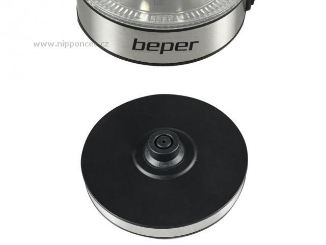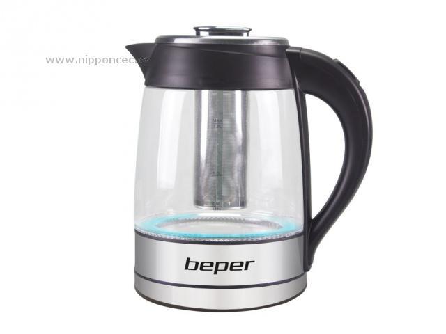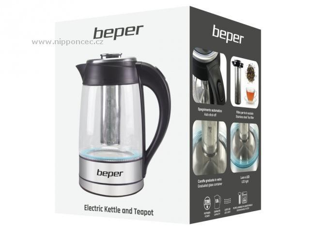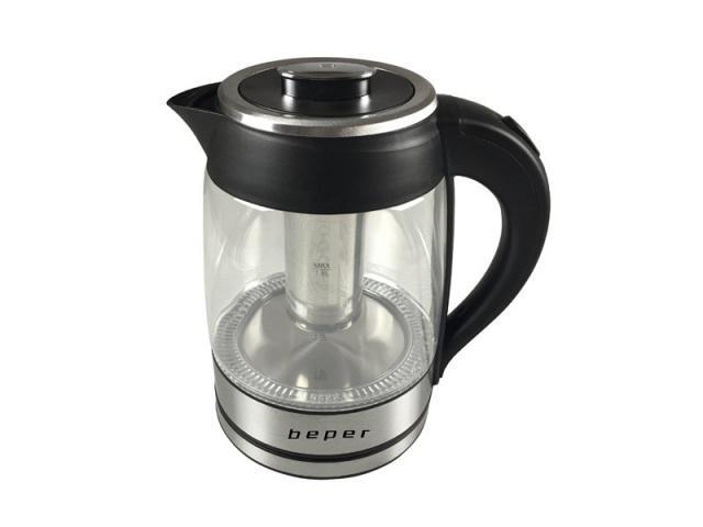 Elegantní skleněná rychlovarná konvice BEPER BB103 je určena nejen na běžné ohřátí vody, ale s vyjímatelným sítkem uvnitř konvice s ní snadno uvaříte i čaj. Sítko na čaj je vyrobeno z nerezové oceli. Konvice má v době provozu efektivní modré LED podsvícení, čímž se stane pěkným kuchyňským doplňkem. Má skrytou varnou spirálu, obsah 1,8 litru, vypínač na rukojeti, základnu s navíječem kabelu a odnímatelný a omyvatelný filtr. Dále disponuje automatickým vypnutím při dosažení teploty a pojistkou proti přehřátí.