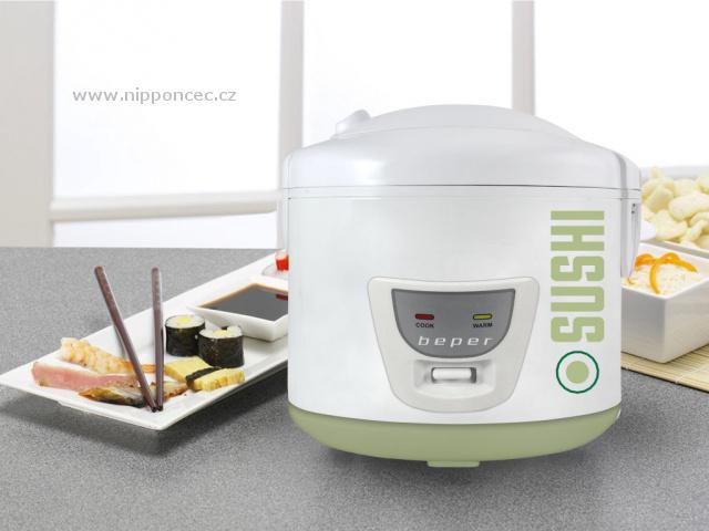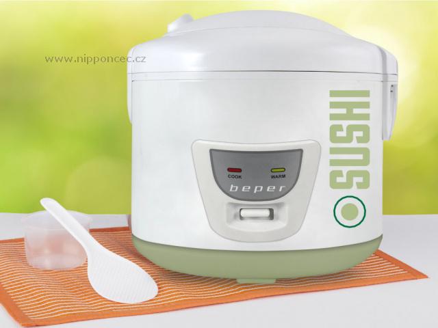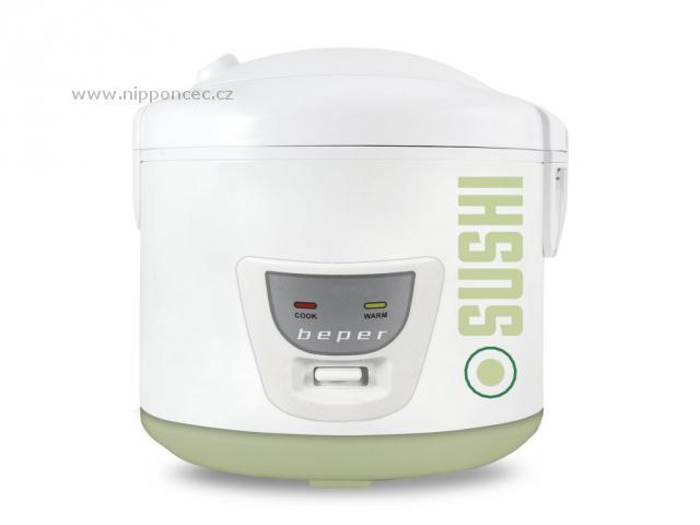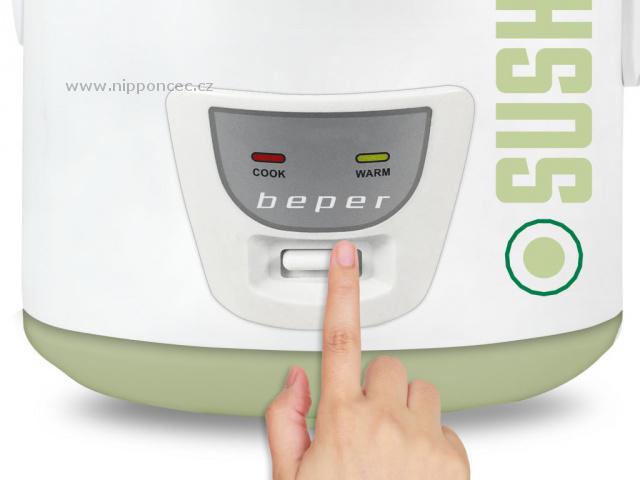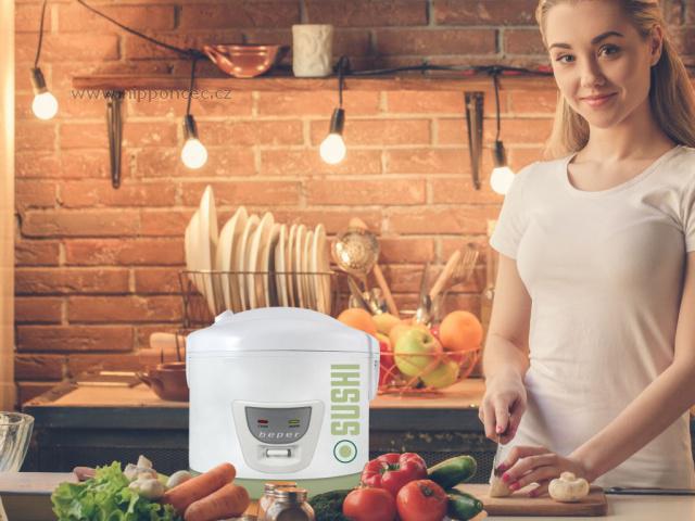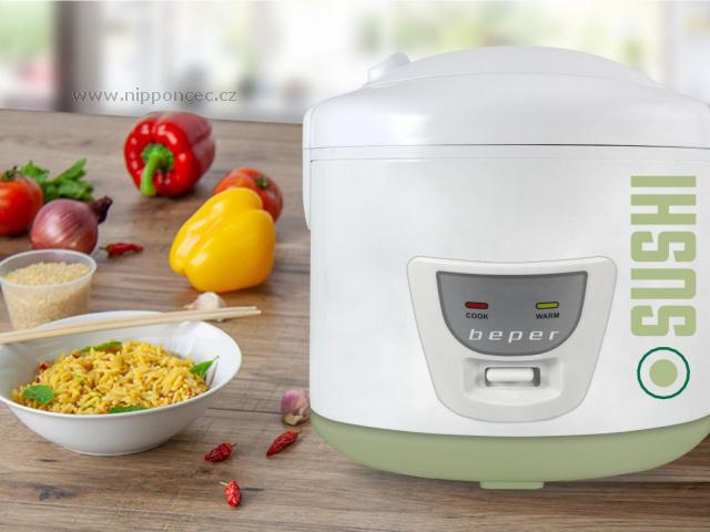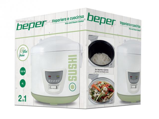 BEPER BC100 Vivi Bene Sushi je hrnec pro rychlou a snadnou přípravu rýže a dalších zdravých pokrmů pomocí vaření v páře. Rýžovar s celkovým objemem 4 litry umožňuje přípravu až 1 kg rýže. K dispozici je funkce Keep Warm pro udržení ideální teploty pokrmu po ukončení vaření. Parní koš, který je součástí balení, umožňuje zdravě vařit v páře různé pokrmy jako např. zeleninu, ryby a maso. Vnitřní hliníková nádoba má nepřilnavou úpravu pro snadné čistění a je vyjímatelná. Součástí balení je příslušenství v podobě špachtle na rýži, parního koše a odměrné nádobky.