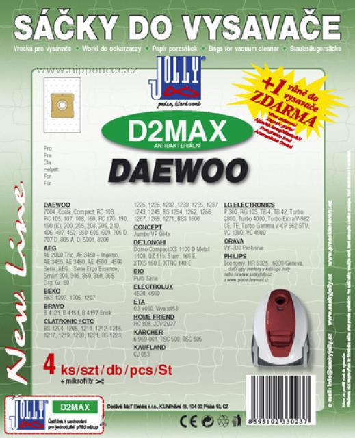Jolly D2 MAX textilní sáčky sáčky - balení 4ks náhradních sáčků pro vysavače různých značek , z netkané textilie, anitibakteriálních, součástí každého balení je vůně zdarma a filtr k zastřižení. Tyto sáčky do vysavače můžete použít jako náhradní sáčky pro vysavače ADIX, AEG, AFK, ALASKA, ALPINA, AMAZONBASICS, BEEM, BEKO, BESTRON, BOMANN, BRAVO, CLATRONIC, CONCEPT, CONDEL, DAEWOO, DE SINA, DELONGHI, DIRT DEVIL, DOMO, DURABRAND, E-MATIC, ECG, ECRON, EFBE SCHOTT, EIO, EMIDE, EST, ETA, FAGOR, FAKIR, FIRST, GOBLIN, GRUNDIG, HANSEATIC, IDE LINE, IMETEC, INSPIRA, KALORIK, KENWOOD, LCE, LG ELECTRONICS, LLOYDS, LORD, MEDION, MELISSA, MONIX, MPM, NILFISK, OBH, OMEGA, OPTIMUM, ORAVA, PHILIPS, PRINCESS, PRIVILEG, PROLINE, ROHNSON, ROTEL, SALCO, SAMSUNG, SANYO, SATRAP, SCARLETT, SENCOR, SEVERIN, SOLAC, SUPERIOR, SUPPORT, TAURUS, TCHIBO, TRISA, TRISTAR, UFESA,VOLTA, VITEK, WELTSTAR, WILFA ... a dalších, dle kompatibilních modelů uvedených v sekci "Určeno pro vysavače".