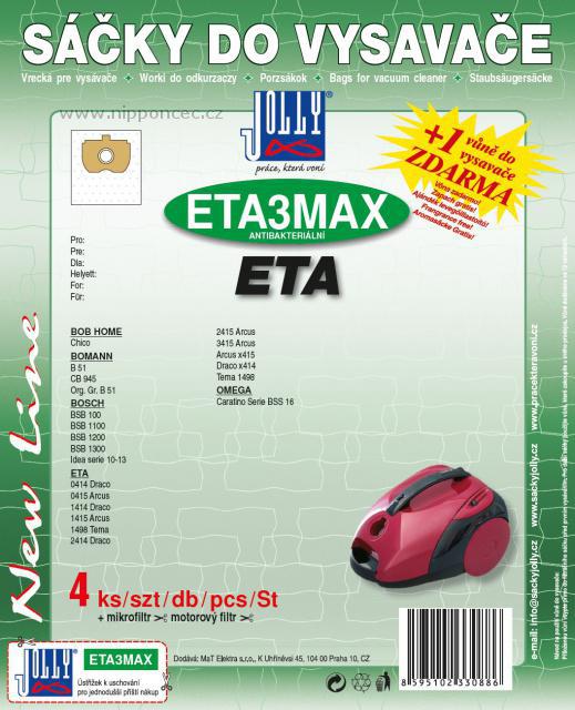 Jolly ETA3 MAX to je dodávka 8 ks náhradních sáčků do vysavačů BOB HOME Chico, BOMANN, BOSCH Typ. R, ETA 414 Draco, ETA 0415 Arcus, ETA 1415 Arcus, ETA 1414 Draco, OMEGA, Siemens typ N, ETA 1498 Tema, ETA 2414 Draco, ETA 3415 Arcu, ETA Draco 1500W a dalších značek a typů, vysavačů, z netkané textilie, antibakteriálních, součástí balení je 2x vůně zdarma, 2x filtr, 2x motorový filtr.