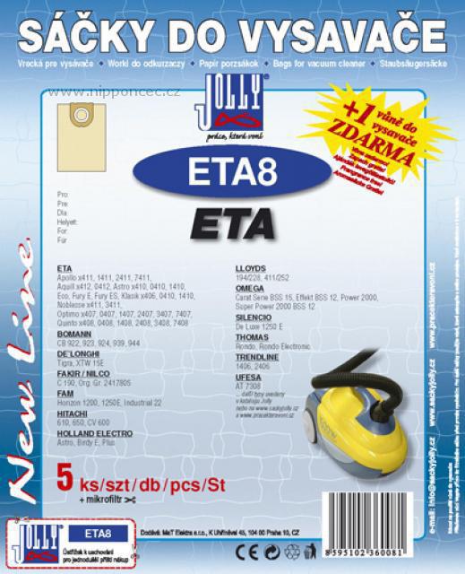 Sáčky do vysavače Jolly ETA8 papírové 5ks Jolly ETA8 to je balení 5ks náhradních sáčků pro vysavač ETA . 406 Serie, ETA .407 Optimo, ETA .410 Astro, ETA .819 Nobel, ETA 0406 Klasik, ETA 0408 Quinto Eco, ETA 0412 Aquill, ETA 1410 Astro, ETA 1452 Generoso, ETA 2406 Klasik, ETA 2407 Optimo, ETA 2411 Apollo, ETA 2861 Nobel, ETA 3408 Maestro, ETA 7407 Optimo, ETA 7408 Quinto, Rytmus, ETA 7411 Apollo, ETA Astro 1600W, Značení SWIRL X28, Značení MENALUX 6100P, Značení ETA 13, Značení ETA 16, Značení ETA 19, Značení ETA 33 a dalších typů z filtračního papíru, součástí balení je 1x vůně zdarma, a 1x mikrofiltr k nástřihu. - Sáčky Jolly ETA8 do vysavače Eta x406, x407, x408, x410, x861... a jiných