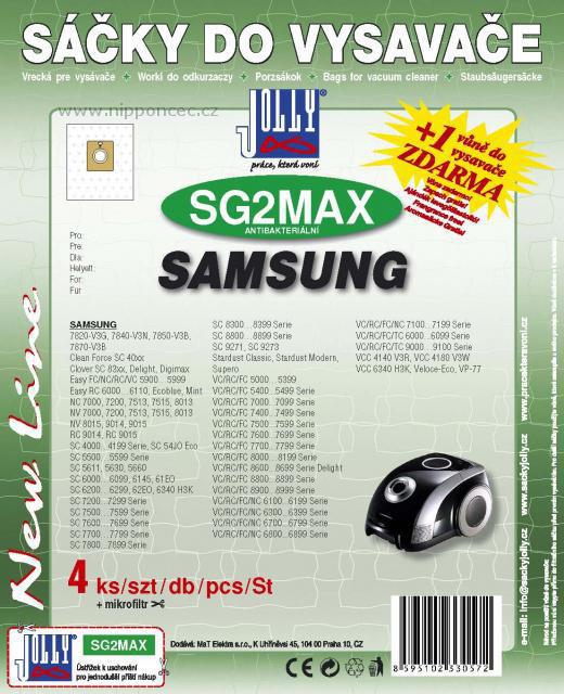 Sáčky do vysavače Jolly SG2 MAX jsou sáčky náhradní (alternativní) pro vysavače Samsung širší škály. Sáčky z netkané textilie jsou antibakteriální, součástí balení sáčků je mikrofiltr k nástřihu a vůně zdarma. Sáčky Jolly - s označením MAX - jsou sáčky nové generace s vysokou schopností filtrace. Ať již je nazveme jakkoli - textilní, z netkané textilie, mikrovlákno, SMS - jedno mají vždy společné - a to je fakt, že jsou syntetické - vyhovující zvyšujícím se potřebám koncového uživatele, z hlediska výroby i následné likvidace odpadu jsou ekologičtější.