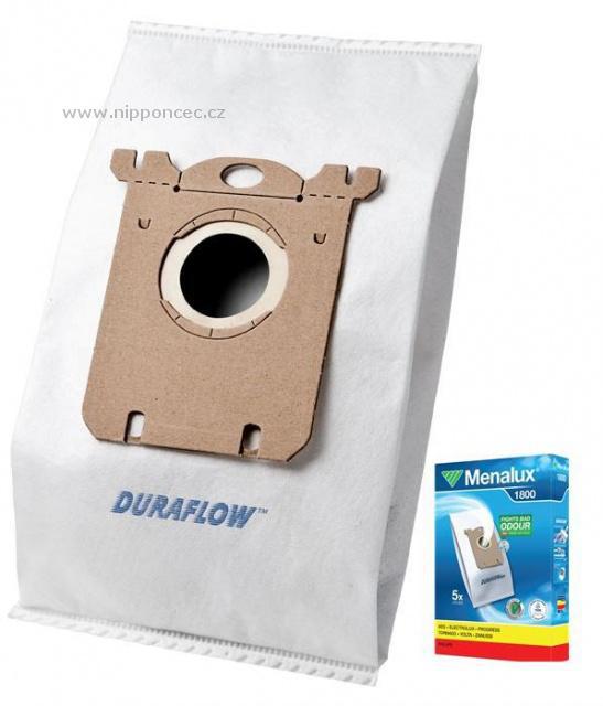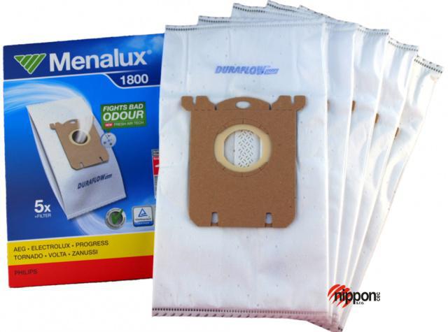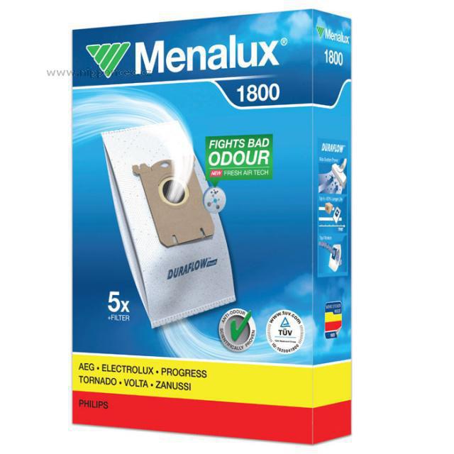 Sáčky do vysavače MENALUX 1800 - alternativa s-bag pro vysavače Electrolux, Philips, AEG Sáčky do vysavačů Menalux 1800 5ks jsou syntetické sáčky typu Sbag (S-bag), které vyrábí Electrolux pod svou značkou Menalux. S-Bag sáčky jsou vyrobeny z netkaná textilie DURAFLOW™, v balení je navíc filtr k nástřihu. Tento druh sáčků je pasuje do mnoha vysavačů AEG, ELECTROLUX, PHILIPS, Tornado, Volta, Zanussi a dalších sáčkových vysavačů. FRESH AIR TECH Menalux ►Tyto syntetické prachové sáčky brání nepříjemným pachům organického i anorganického původu = provedení Anti-Odour. Proč zvolit sáčky MENALUX z netkané textilie DURAFLOWTM Fresh nebo DURAFLOWTM : Menalux DURAFLOWTM Fresh = výjimečný sáček: Nové provedení sáčků syntetických sáčků Menalux (to poznáte podle označení na krabici (NEW - Fresh AIR TECH = FIGHTS BAD ODOUR) brání nepříjemným pachům jako jsou odpadky, pach z domácích mazlíčků, pot, cigaretový kouř, aromatické druhy zeleniny jako například cibule, a jiné, v úniku po vysávání ze sáčku. Některé provedení sáčků z netkané textilie je k dispozici pouze v původním provedení, postupně společnost Menalux přechází na provedení nové.