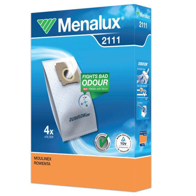 Sáčky Menalux 2111 pro vysavače Rowenta Compacteo, Compacteo Ergo syntetické 4ks Sáčky do vysavačů Menalux 2111 jsou syntetické prachové sáčky z netkané textilie, 4ks v balení, a 1x filtr, vyrobené z jedinečného materiálu DURAFLOW TM Fresh který je odolný i proti zápachu - tzv. "anti-odour". Určeno pro vysavače ROWENTA: Compacteo RO1700 - 1799 RO171701 Compacteo RO171901 Compacteo RO172101 RO173301 RO175501 RO178301 RO176701 RO179501 City Space RO2441WA Compacteo Ergo RO522... RO524...RO525.... Ergo RO527... Ergo RO529... Mini Space RO185501 a další vysavače této řady.. Sáčky disponují certifikátem kvality TÜV Rheinland. Výrobce Electrolux pod svou značkou Menalux.