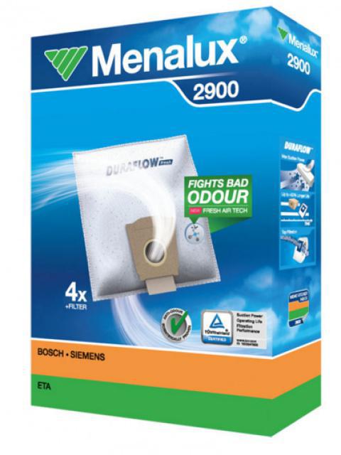 Sáčky Menalux 2900 do vysavače Bosch a Siemens 4ks syntetické Sáčky do vysavačů Menalux 2900 jsou syntetické prachové sáčky z netkané textilie, 4 ks v balení, a filtr, vyrobené z jedinečného materiálu DURAFLOW TM Fresh který je odolný i proti zápachu - tzv. "anti-odour". Sáčky jsou určeny pro vysavače Bosch a Siemens. Sáčky disponují certifikátem kvality TÜV Rheinland. Výrobce Electrolux pod svou značkou Menalux.