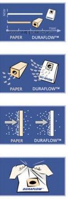 Jedinečný syntetický materiál s přídavkem Tego Sorb: Syntetické sáčky do vysavače DURAFLOWTM mají 3 vrstvy: Vnější vrstvu - tavenou - netkanou. Střední vrstva, tavená, je vyrobena z tavené polypropylénové směsi, s přidavkem aktivního činidla Tego Sorb. Toto činidlo vyniká účinností pro absorbci nepříjemných pachů a zajišťuje zachycení těchto typů molekul v tavené vrstvě. Tato vrstva také působí jako filtr, brání ucpání pórů sáčku mikročásticemi a tím zajišťuje jeho trvanlivost. Vnější vrstva - tavená - netkaná - chrání prachový sáček vysavače proti roztržení - tím chrání i dvě předchozí vrstvy, mimo svou filtrační schopnost.