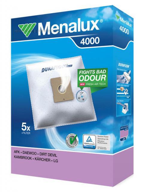 Sáčky do vysavače Menalux 4000 syntetické, 5 ks v balení, 1 ks mikrofiltr. Vyrobené z kvalitního materiálu Duraflow - netkaná textilie, odolné i proti zápachu. Sáčky jsou vhodné pro vysavače Alaska, Bomann, Bravo, Clatronic, Concept, Daewoo, Dirt Devil, DeLonghi, Eio, ETA, LG, Omega, Philips, Severin a mnoho dalších vysavačů zde uvedených. Výrobce Electrolux pod svou značkou Menalux.