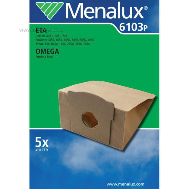 Sáčky do vysavače Menalux 6103P jsou vyrobeny z filtračního papíru, balení obsahuje 5 sáčků a filtr k zastřižení.Výrobce Menalux - součást koncernu Electrolux. Sáčky jsou určeny pro vysavače ETA 450 Proximo ETA 451 Demon ETA 451 Galaxie ETA 454 Trino ETA 0499 Trimo ETA 1450 Proximo ETA 1451 Demon ETA 1451 Galaxie ETA 1454 Trino ETA 1497 Denso ETA 2450 Proximo ETA 2454 Trino ETA 3450 Proximo ETA 3454 Trino ETA 7450 Proximo ETA 7451 Demon ETA 7454 Trino FAKIR 2491804 FAKIR C 200 FAKIR Org. Gr. 2429805 FAKIR Org. Gr. 2491804 GORENJE 2000 OMEGA Avant BSS 11 VITEK VT 1806