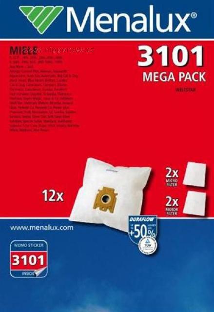Menalux 3101MP Sáčky do vysavače syntetické pro typ Miele GN Sáčky do vysavače MIELE typ GN textilní, 12ks + 4 filtry, value pack Menalux 3101MP pro MIELE GN. Sáčky jsou vyrobeny z netkané textilie Duraflow - odolné i proti pachům. Tyto sáčky pro vysavače MIELE (typ GN) vyrábí Electrolux pod svou značkou Menalux.