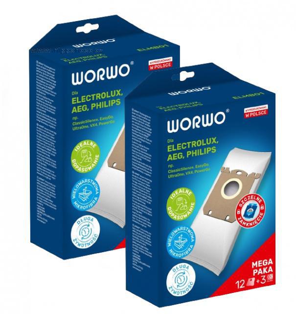 Sáčky Worwo ELMB01 24ks pro vysavače s-bag Electrolux, Philips, AEG Worwo ELMB01 (dříve ELMB01K) jsou alternativní sáčky typu s-bag do vysavačů S-BAG AEG-ELECTROLUX-PHILIPS SBAG. Tyto sáčky jsou alternativou sáčků S-Bag s kapacitou 3,5 litru v malém balení Electrolux E200, E200B, E200M, E201B, E201M, E201S, E202, E203, E203S, E206B, E212B, Menalux 1800, Menalux 1800MP, Philips FC8019/01, Philips FC8021/03, Philips FC8022/04, Philips FC8023/04, Swirl E82, Swirl PH86
