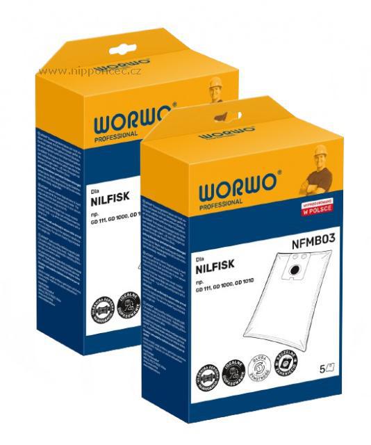 Sáčky do vysavačů Worwo NFMB03 Professional 10ks Sáčky Worwo NFMB03 (Worwo NFMB03K) jsou kompatibilní pro značení NILFISK 81846000, NILFISK 82017401, NILFISK 82222800, NILFISK 82222900, NILFISK 82367805, NILFISK 82367810, NILFISK 86180000, Jolly NIL1 MAX a jsou určeny pro vysavače NILFISK GD 1000, NILFISK Business, NILFISK GD 1005, NILFISK GD 1010, NILFISK GD 1011, NILFISK GD 111, NILFISK GD 910, NILFISK HDS 2000, NILFISK VP 300, NILFISK VP 300 Eco HEPA EU, NILFISK VP 300 HEPA, NILFISK VP 300 HEPA EU Basic, NILFISK VP 600 EU, NILFISK VP 600 Eco, NILFISK VP 600 STD 2, NILFISK GD 1000 a dalších vysavačů této značky. Sáčky Worwo NFMB03 jsou sáčky průmyslové, pro silné spojení všech vrstev sáčku jsou svařeny ultrazvukem. Sáčky do vysavačům Worwo NFMB03 Professional jsou odolné proti roztržení, neprotrhnou se při náhodném vysátí vlhkého materiálu. Speciální filtrační vrstva zajišťuje dobrou filtraci i problematických jemných částic. - Průmyslové sáčky Worwo NFMB03 do vysavačů Nilfisk GD 1000, GD 1010, Saltix, VP 300, VP 600