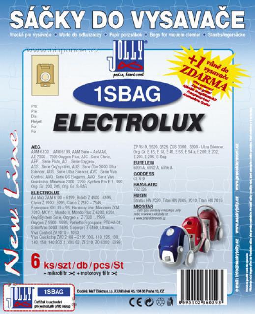 - Sáčky do vysavače Jolly 1SBAG Typu s-bag pasují do většiny vysavačů různých typových řad a modelů - např. Electrolux AirMax, AirMax Green, Bolido, Clario, Clario 2, ErgoSpace, ErgoSpace Green, Essensio, Excellio, JetMaxx, JetMaxx Green, Mondo Plus, Oxygen, Superpro, UltraSilencer, UltraSilencer Green, Viva Control, Viva Quickstop.