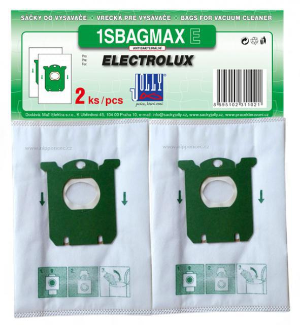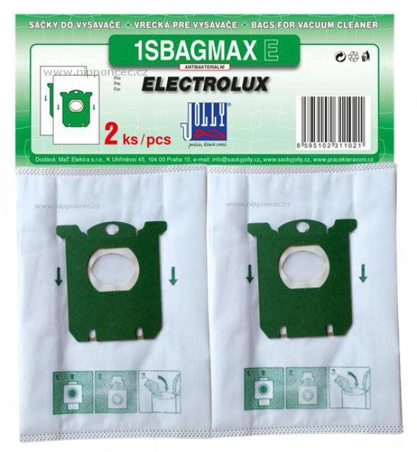 Balení 2ks náhradních sáčků do vysavače typu s-bag z netkané textilie, antibakteriální. Sáčky do vysavače Jolly 1SBAG MAX můžete použít jako náhradní sáčky pro modely vysavačů Typ s-bag a níže uvedené a mnoho dalších. Tyto sáčky jsou alternativou (neoriginální náhradou) sáčků S-Bag s kapacitou 3,5 litru v malém balení E201 Electrolux nebo větším balením E201M s plastovým držákem. Sáčky jsou kompatibilní .Sáčky jsou kompatibilní pro značení Electrolux E200, Electrolux E201, Electrolux E202, E203, E205, E206, Electrolux E212, Jolly 1SBAG, KOMA SB01, Philips FC8019/03, Philips FC8019/01, Menalux 1800P a určeny pro modelové řady AEG a Electrolux: AirMax, Bolido, Clario, Clario 2, Classic Silence, ErgoSpace, Excelio, Essensio, JetMaxx, Maximus, Oxygen, Oxy3system, UltraSilencer, UltraOne, Viva Control, Viva Quickstop. Také pro Philips Autoclean, Ergofit, Jewel, Marathon, Performer, Studio, Specialist, Silent Star, Universe.