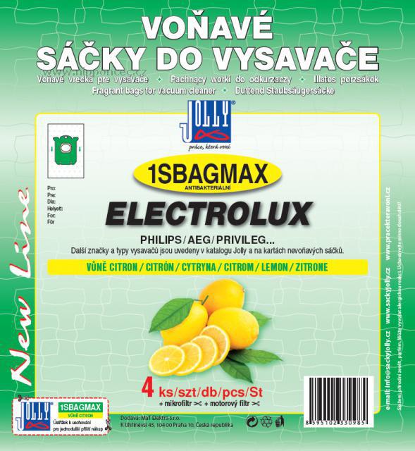 Balení 4ks voňavých sáčků do vysavače Eletrolux-AEG-Philips z netkané textilie, antibakteriálních, součástí balení je mikrofiltr a motorový filtr, oba k nástřihu. Sáčky do vysavače Jolly 1SBAG MAX můžete použít jako náhradní sáčky pro modely vysavačů Typ s-bag a níže uvedené a mnoho dalších. Tyto sáčky jsou alternativou (neoriginální náhradou) sáčků S-Bag s kapacitou 3,5 litru v malém balení E201 Electrolux nebo větším balením E201M s plastovým držákem. Sáčky jsou kompatibilní .Sáčky jsou kompatibilní pro značení Electrolux E200, Electrolux E201, Electrolux E202, E203, E205, E206, Electrolux E212, Jolly 1SBAG, KOMA SB01, Philips FC8019/03, Philips FC8019/01, Menalux 1800P a určeny pro modelové řady AEG a Electrolux: AirMax, Bolido, Clario, Clario 2, Classic Silence, ErgoSpace, Excelio, Essensio, JetMaxx, Maximus, Oxygen, Oxy3system, UltraSilencer, UltraOne, Viva Control, Viva Quickstop. Také pro Philips Autoclean, Ergofit, Jewel, Marathon, Performer, Studio, Specialist, Silent Star, Universe.