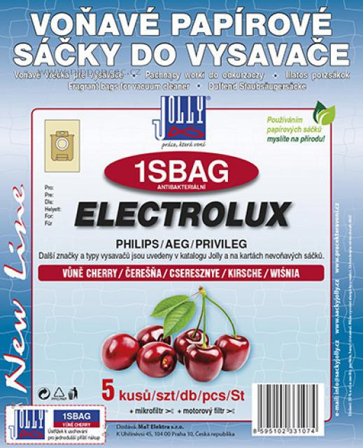 Sáčky do vysavače Jolly 1SBAG papírové voňavé (cherry) 5ks Papírové voňavé sáčky do vysavače typu s-bag (Electrolux E200B, E20S, Philips FC8019) 5ks + 2x filtr v balení Jolly 1SBAG pro Electrolux AirMax, AirMax Green, Bolido, Clario, Clario 2, ErgoSpace, ErgoSpace Green, Essensio, Excellio, JetMaxx, JetMaxx Green, Mondo Plus, Maximus, Oxygen, Superpro, UltraSilencer, UltraSilencer Green, UltraOne, Viva Control, Viva Quickstop, Philips Performer a další vysavače.