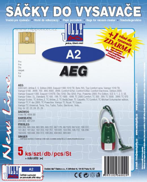 Sáčky do vysavače Jolly A2 papírové 10ks Dodávka 10ks náhradních sáčků do vysavače z filtračního papíru, součástí balení je vůně zdarma a 2x filtr k nástřihu. Sáčky Jolly A2 z filtračního papíru, součástí balení je vůně zdarma a filtr k nástřihu, jsou kompatibilní pro značení výrobců AEG GR. 22, AEG Gr. 23, AEG Gr. 24, AEG Gr. 25, AEG Gr. 26, MENALUX 1001, SWIRL A08, SWIRL A09 a jsou určeny pro vysavače AEG Vampyr : Vampyr 6109, AEG Vampyr 6150 ÖKO , AEG Vampyr 6200, Vampyr 6400, Vampyr 6450, Vampyr 6600, AEG Vampyr 6650 ÖKO, Vampyr 7204, Vampyr 7650, Vampyr 8200, AEG Vampyr 821 až 841, Vampyr 8550 ÖKO, AEG Vampyr TC 300 až 399, TC 3000 až 3999, Vampyr Terra, AEG Vampyr Yello, vysavače PRIVILEG, SINGER, THOMAS a další, zde uvedené.