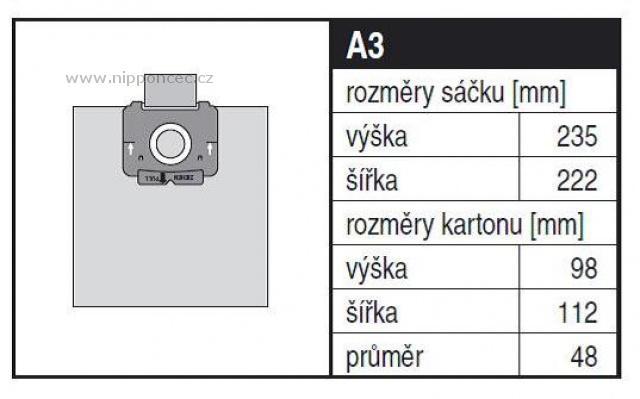 Sáčky nové generace s vysokou schopností filtrace malých částic - vysavač se nezanese jemným prachem = jeho životnost se prodlouží. Větší objem - textilní materiál je pružnější, sáček se dobře přizpůsobí velikosti komory vysavače, můžete jej tak zaplnit zcela, aniž by vysavač ztrácel na výkonu. Hygienická příruba - většina sáčků z netkané textilie je jí vybavena. Je to vlastně jakýsi uzávěr sáčku na kartonku, který při výměně sáčku vytáhnete směrem nahoru - sáček se tím uzavře, nedochází k úniku prachu Sáčky do vysavačů Jolly A3 MAX jsou vyrobeny z antibakteriální netkané textilie.