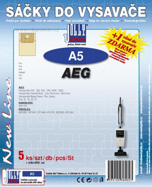 Sáčky do vysavače A5 papírové 5ks Sáčky pro vysavače AEG Vampyrette, Vampyrette Mega Power, Vampyrette De luxe, Space, Duo a dalších vysavačů jsou vyrobeny z vícevrstvého filtračního papíru, součástí balení je vůně zdarma a filtr k nástřihu. Sáčky do vysavače AEG od Jolly jsou určeny pro vysavače osazené sáčkem typu AEG Gr.16, AEG GR.20, AEG GR.27. Tyto sáčky jsou alternativou originálních sáčků pro vysavače AEG osazené totožným typem sáčku.