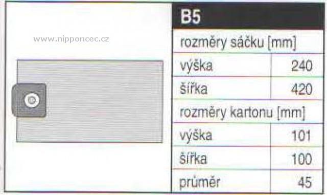 JOLLY B5 průmyslový sáček do vysavače z vícevrstvého filtračního papíru 1 ks v balení rozměry kartonu: šíře 100 mm, výška 101 mm, průměr otvoru 45 mm rozměry prachového sáčku: šíře 420 mm, výška 240 mm