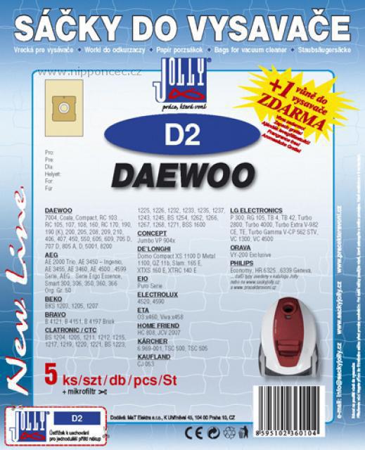 Sáčky do vysavače Jolly D2 papírové 5ks Jolly D2 papírové sáčky - balení 5ks náhradních sáčků pro vysavače různých značek z filtračního papíru, součástí balení je vůně zdarma a filtr k zastřižení. Tyto sáčky do vysavače můžete použít jako náhradní sáčky pro vysavače ADIX, AEG, AFK, ALASKA, ALPINA, AMAZONBASICS, BEEM, BEKO, BESTRON, BOMANN, BRAVO, CLATRONIC, CONCEPT, CONDEL, DAEWOO, DE SINA, DELONGHI, DIRT DEVIL, DOMO, DURABRAND, E-MATIC, ECG, ECRON, EFBE SCHOTT, EIO, EMIDE, EST, ETA, FAGOR, FAKIR, FIRST, GOBLIN, GRUNDIG, HANSEATIC, IDE LINE, IMETEC, INSPIRA, KALORIK, KENWOOD, LCE, LG ELECTRONICS, LLOYDS, LORD, MEDION, MELISSA, MONIX, MPM, NILFISK, OBH, OMEGA, OPTIMUM, ORAVA, PHILIPS, PRINCESS, PRIVILEG, PROLINE, ROHNSON, ROTEL, SALCO, SAMSUNG, SANYO, SATRAP, SCARLETT, SENCOR, SEVERIN, SOLAC, SUPERIOR, SUPPORT, TAURUS, TCHIBO, TRISA, TRISTAR, UFESA,VOLTA, VITEK, WELTSTAR, WILFA ... a dalších, dle kompatibilních modelů uvedených v sekci "Určeno pro vysavače". - Sáčky Jolly D2 do vysavače papírové