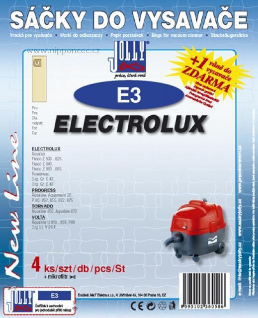 Sáčky do vysavače Jolly E3 papírové 4ks Sáčky Jolly E3 jsou kompatibilní pro značení výrobců ELECTROLUX E47, ELECTROLUX E48, MENALUX 1285P, MENALUX 1286P, SWIRL E46, SWIRL P46 a jsou určeny pro vysavače ELECTROLUX Aqualux, ELECTROLUX Flexio Z 845, ELECTROLUX Z 800, PROGRESS P 875...a dalších modelů a značek zde uvedených. Sáčky jsou vyrobeny filtračního papíru, součástí balení je 1x vůně zdarma a 1x filtr k zastřižení. - Sáčky Jolly E3 do vysavačů Electrolux, Progress, Tornado