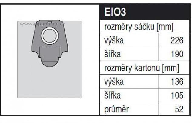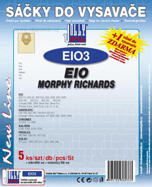 Sáčky do vysavače Jolly EIO3 papírové 5ks Jolly EIO3 - balení 5ks náhradních sáčků pro vysavače AKA, Baur, Braun, Chromex, Collo, Dicaff, EIO, EIO BSS 90/ až BSS 91, BSS 93/ až BSS 94, EIO Nova Plus, EIO Premier, EIO BSS, ELIN Nova Plus 1400, EWT, Elin, Elram, Fram, Hanseatic, Kalorik, MKM, Nordline, Privileg, Solac, Vetrella, Viking, Swirl EIO86 kompatibilní, zde uvedených modelových značení. Sáčky jsou vyrobeny z filtračního papíru, součástí balení je 1x vůně zdarma, 1x mikrofiltr a 1x motorový filtr k nástřihu. - Sáčky Jolly EIO3 do vysavače EIO, Elin, Kalorik, Solac...