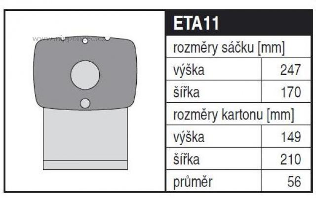 Sáčky do vysavačů Jolly ETA11 jsou vhodné pro modely a značky: ETA 400 Serie ETA 0400 ETA 2400 KALORIK 5710 KALORIK 5711 KALORIK 5712 KALORIK 5713 KALORIK 5714 KALORIK 5715 KALORIK 5716 KALORIK 5717 KALORIK 5786 ....