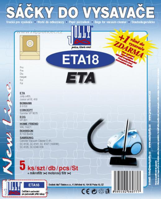 Sáčky do vysavače Jolly ETA18 papírové 5ks Jolly ETA18 to je balení 5ks náhradních sáčků kompatibilních pro značení výrobců ETA 24, ETA 26, SWIRL Y60, MENALUX 3502P, a určených k vysavačům CONCEPT VP 8112 Polo, CONCEPT VP 9070 Sprinter, ECG VP 801, ETA 1455 Jolly, ETA 418 Junior, ETA 455 Jolly, ETA 1418 Junior, ETA 1455 Jolly, HOME FRIEND VAC 14J21, MORGANS Cyclone 1300 ER, PHILIPS HR 6325 až HR 6339 Geneva, PHILIPS HR 6325 až HR 6339 Economy, PHILIPS Geneva HR 6325, ROHSON R 163 Beetle, SAMSUNG E41, SAMSUNG VR/RC/FC 1000 EF, ZELMER 01D011 Duo, ZWT BS 900 a dalších značek a modelů zde uvedených, z filtračního papíru, součástí balení je 1x vůně zdarma, 1x motorový filtr a 1x mikrofiltr k nástřihu. Tyto sáčky do vysavače můžete použít jako náhradní sáčky do uvedených vysavačů - tyto sáčky jsou alternativou sáčků originálních pro daný typ vysavače. - Sáčky Jolly ETA18 do vysavače Eta 455 Jolly, ETA 418 Junior, Alaska, Bomann, Concept,Salco ...
