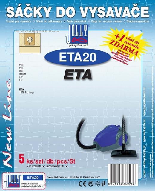 Sáčky Jolly ETA20 papírové 10ks pro Eta Rio Vega 1678 Jolly ETA20 : dodávka 10ks náhradních sáčků pro vysavač Eta Rio Vega, Eta 1678, Eta značení 28 z filtračního papíru, součástí balení je 2x vůně zdarma, 2x motorový filtr a 2x mikrofiltr k nástřihu. Sáčky do vysavače Jolly ETA20 můžete použít jako náhradní sáčky do uvedených vysavačů - tyto sáčky jsou alternativou sáčků originálních pro daný typ vysavače.- Sáčky Jolly ETA20 do vysavače Eta Rio Vega, Eta 1678, Eta značení 28